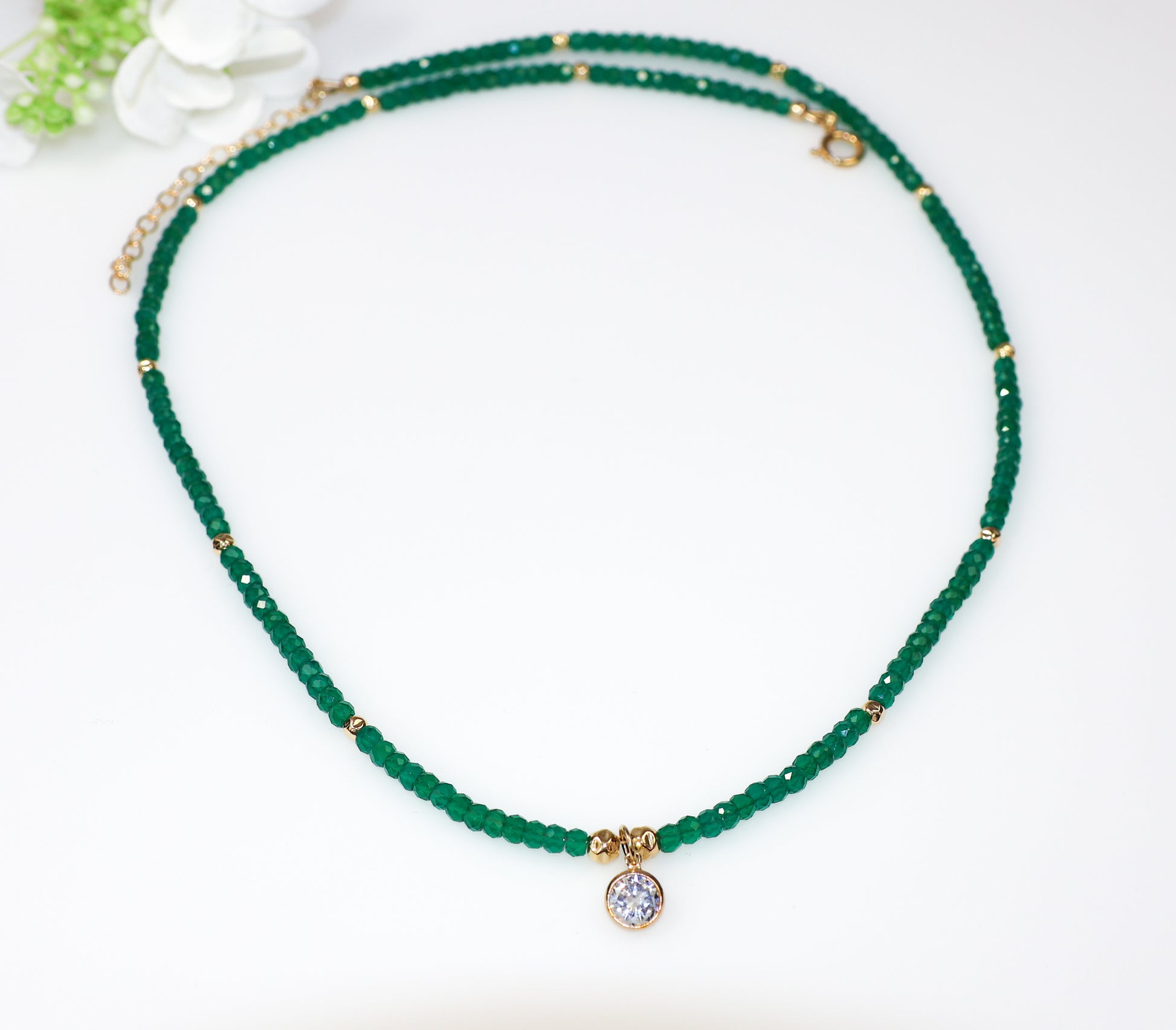 Add a splash of color and luxury with this exquisite Kelly Necklace. It features a strand of vibrant, sparkling green onyx gemstones accented with stations of faceted gold beads for added elegance. Necklace is embellished by a gleaming crystal solitaire bezel pendant that enhances the rich green hues and exudes timeless chic and sophistication. Green onyx is a beautiful semi-precious stone that resembles emerald due to its vivid deep green color and translucence. Necklace fastens with a spring ring clasp and comes with an adjustable 2-inch chain extender.