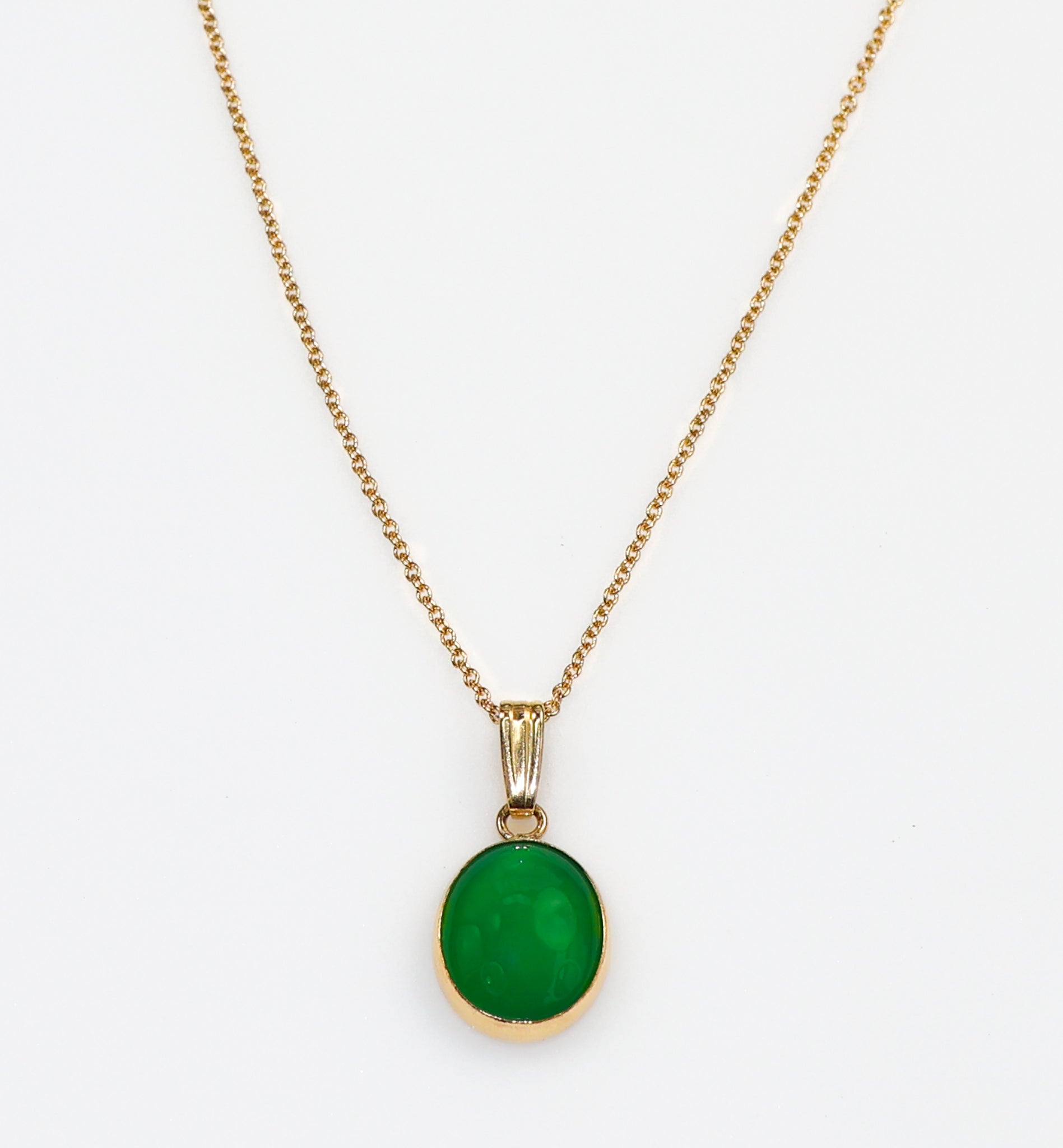 Add a splash of color with this exquisite Green Onyx Necklace. It features a vibrant green onyx oval gemstone that is bezel set in a cabochon mounting. Pendant dangles from a round cable chain that fastens with a spring ring clasp and is adjustable with 3 different loops. Green onyx is a beautiful semi-precious stone that resembles emerald due to its vivid deep green color and translucence.