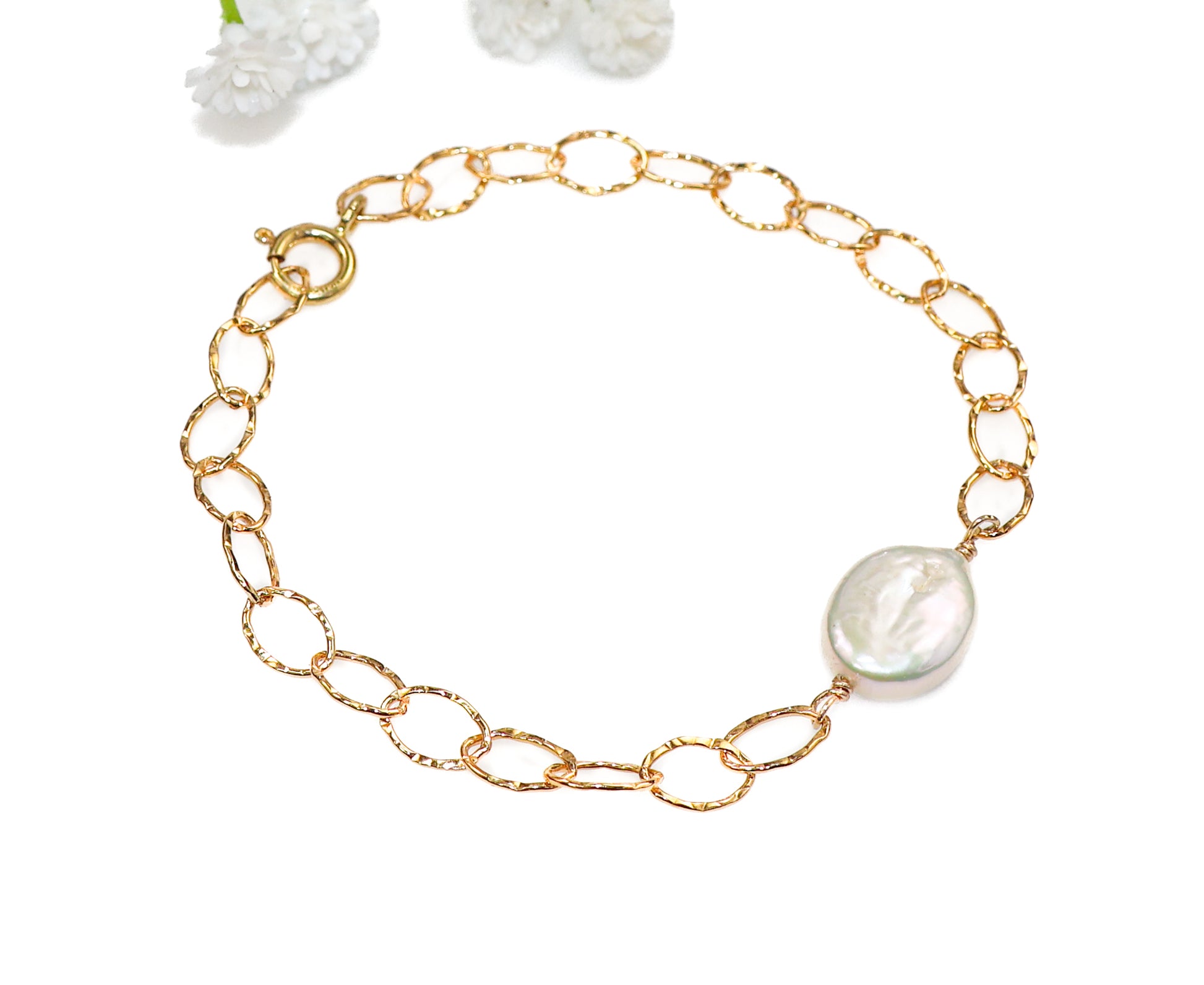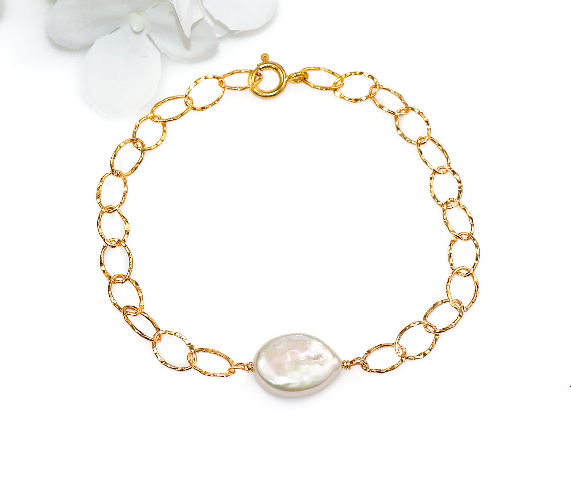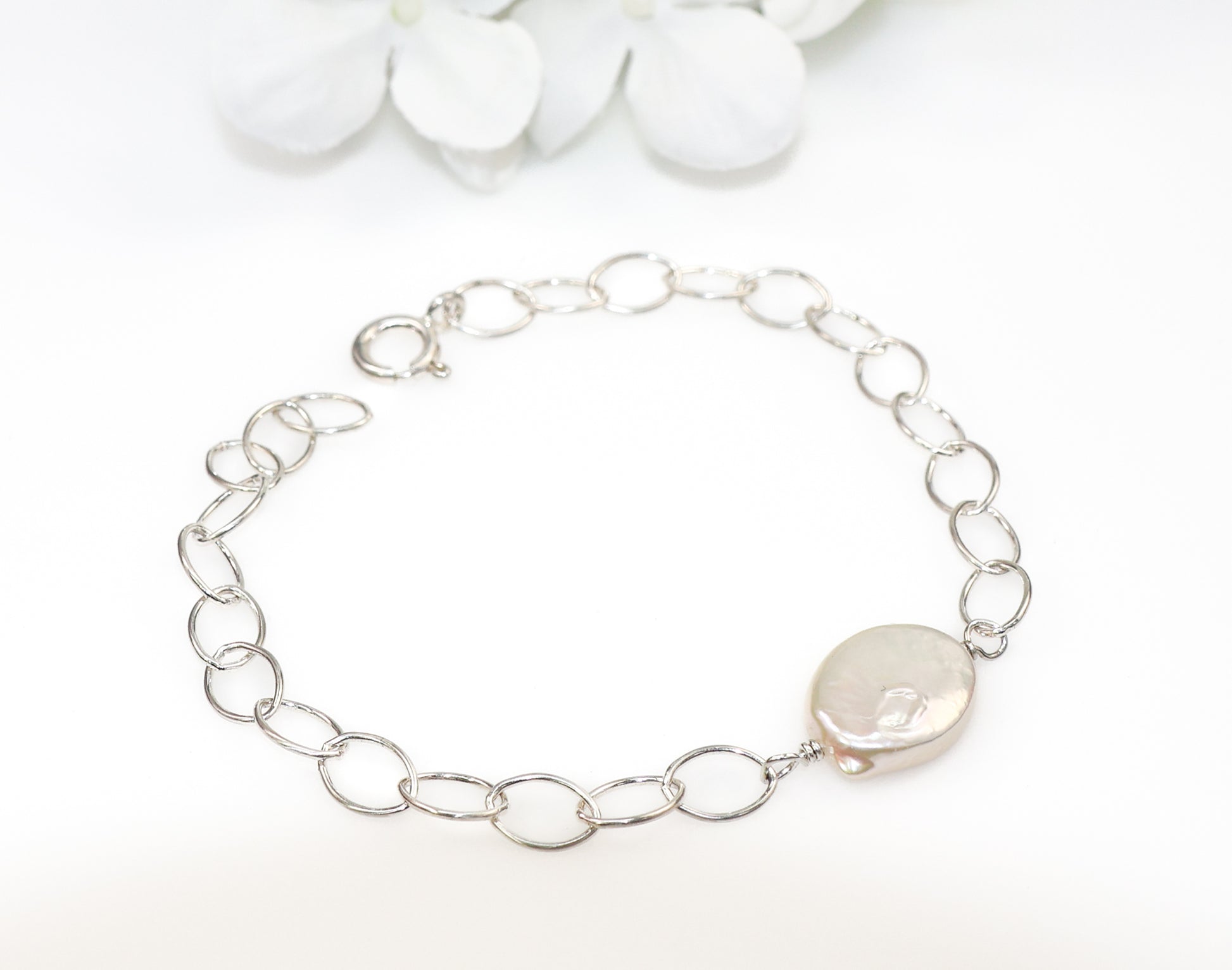 This luminous Jasmine Pearl Bracelet is both elegant and dazzling. Known for their organic shape and incredible luster, it features a natural white flat keshi pearl in the shape of a Jasmine flower petal. Pearl is held on each side by an oval link chain that complements the form of the pearl. Bracelet fastens with a spring ring clasp and is fully adjustable for a perfect fit.