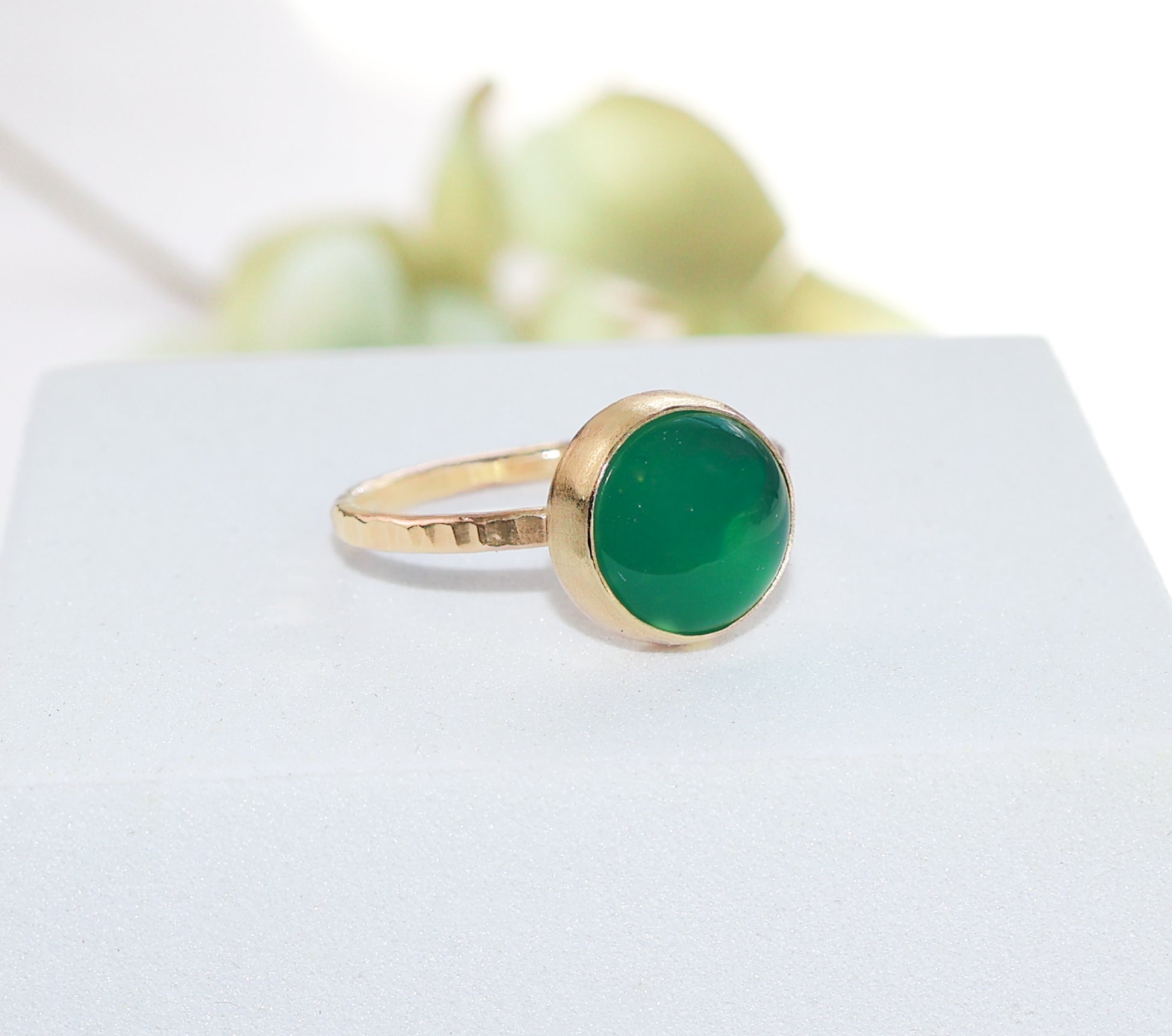 Add a pop of color to your hand with this dazzling Laurel Ring. It features a vibrant green onyx cabochon that is bezel set on a textured band for a sparkling accent. Green onyx is a beautiful semi-precious stone that resembles emerald due to its vivid deep green color and translucence. Wear it alone or pair it with our stacking rings for a stylish look. Each ring sold individually.